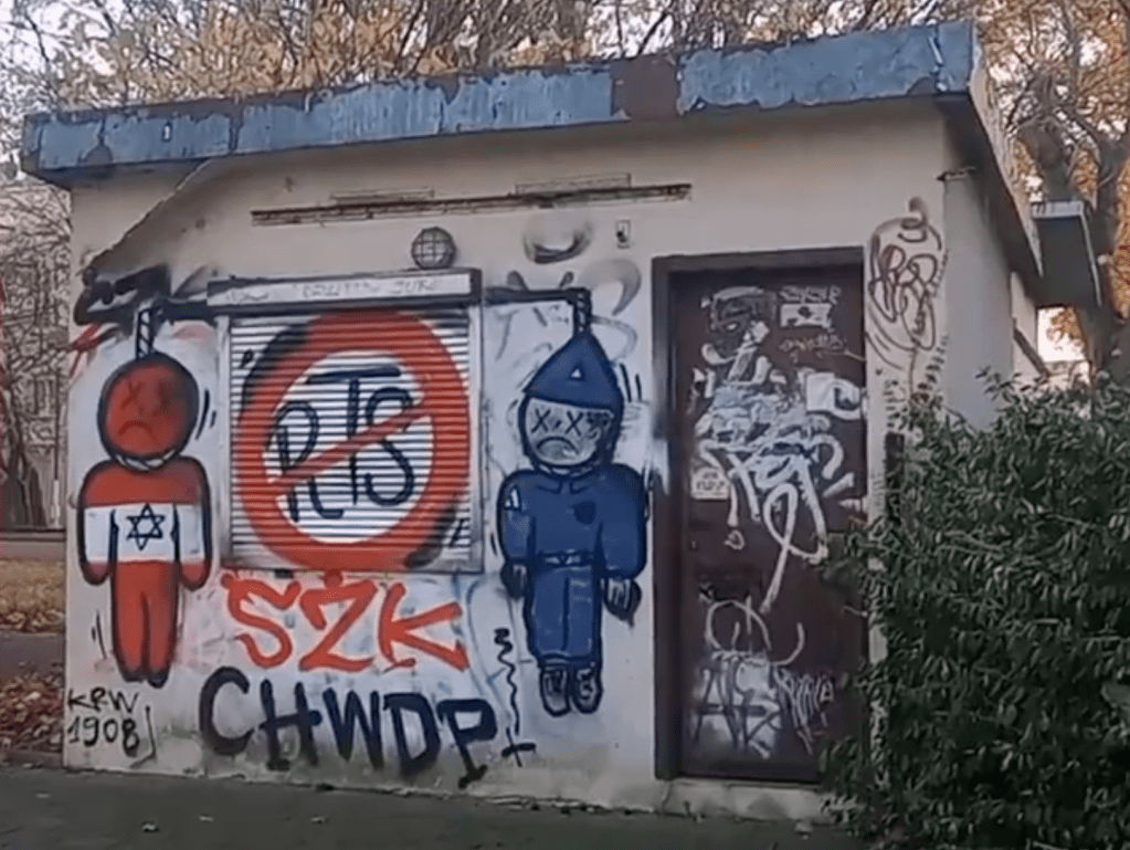 I was shocked to see the anti-Semitic graffiti reach a new nadir there, but not surprised, considering the giant ŁKS stadium was the main attraction. Colorful murals depicted ŁKS literally lynching RTS players with Jewish stars on their shirts. From my prior research into this nightmare I knew that one of the teams had actually burned Jewish effigies of the other in recent years. Why not celebrate such awfulness with a colorful cartoon?