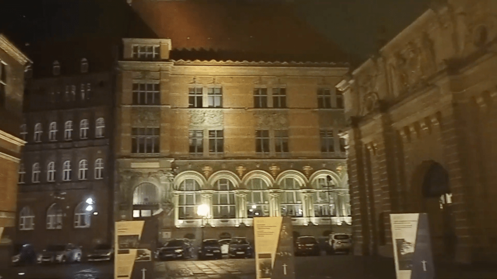 The Main City Hall was built in the 14th and 15th centuries, with the tower completed in 1488. WWII would claim the top of that tower, and the overall damage was extensive enough to require 7 years to repair after the war ended.