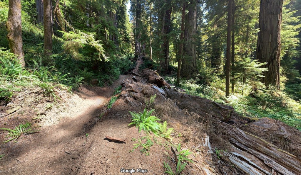 Leaving our camp early in the morn, two of us going ahead of the party, we entered the heavy redwood through which the path led, and traveled on steadily, intending to make “Hardscrabble” before night. In the forest we entered, the trees were very large. We measured one 18 feet diameter and 100 feet to the lower limb. The branches were so closely united above that no sunshine reached the ground. It was silent and gloomy traveling through the forest. We sometimes passed a fallen monarch that was an immense size.