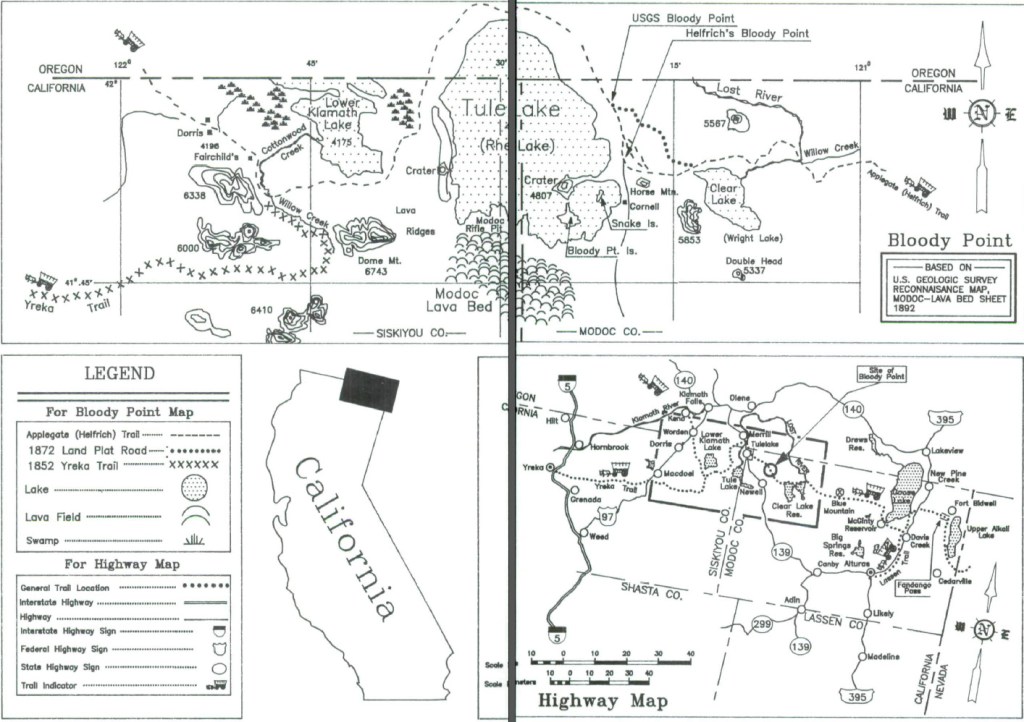 Bloody Point is a place on the north bank of Tule Lake, where a spur of the mountains runs down close to the lake shore. Around this the old emigrant road passed, just beyond being a large open flat covered with tules, wild rye and grass. This was a favorite place for ambuscade.