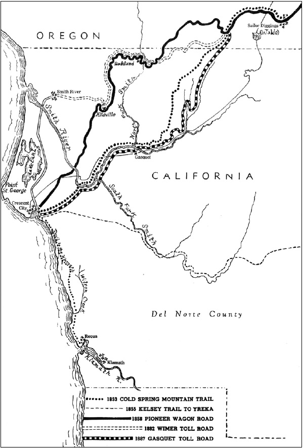 The possibility of taking ship passage to the Crescent City area and joining the next gold rush to Sailors’ Diggings and Jacksonville made the development of a western route, from Crescent City to Jacksonville, attractive.