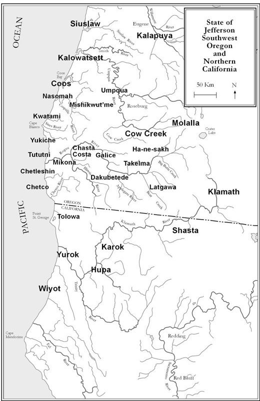 When the ranger militia arrived they set about a policy of extermination that took these conflicts to a whole new level. On the California Coast, exterminations of whole tribes were occurring. Their Athapaskan friends and relatives in the Siskiyou Mountains heard these reports and were not going to give in to the terror of the militias. The Rogue River tribes (Takelmans) banded with the Athapaskans, Shastans, and Cow Creek Umpquas and formed a resistance to the terror being spread. Exterminations and attempts to genocide the whole race of Indians in Northern California and Southern Oregon continued into the later 1850s.