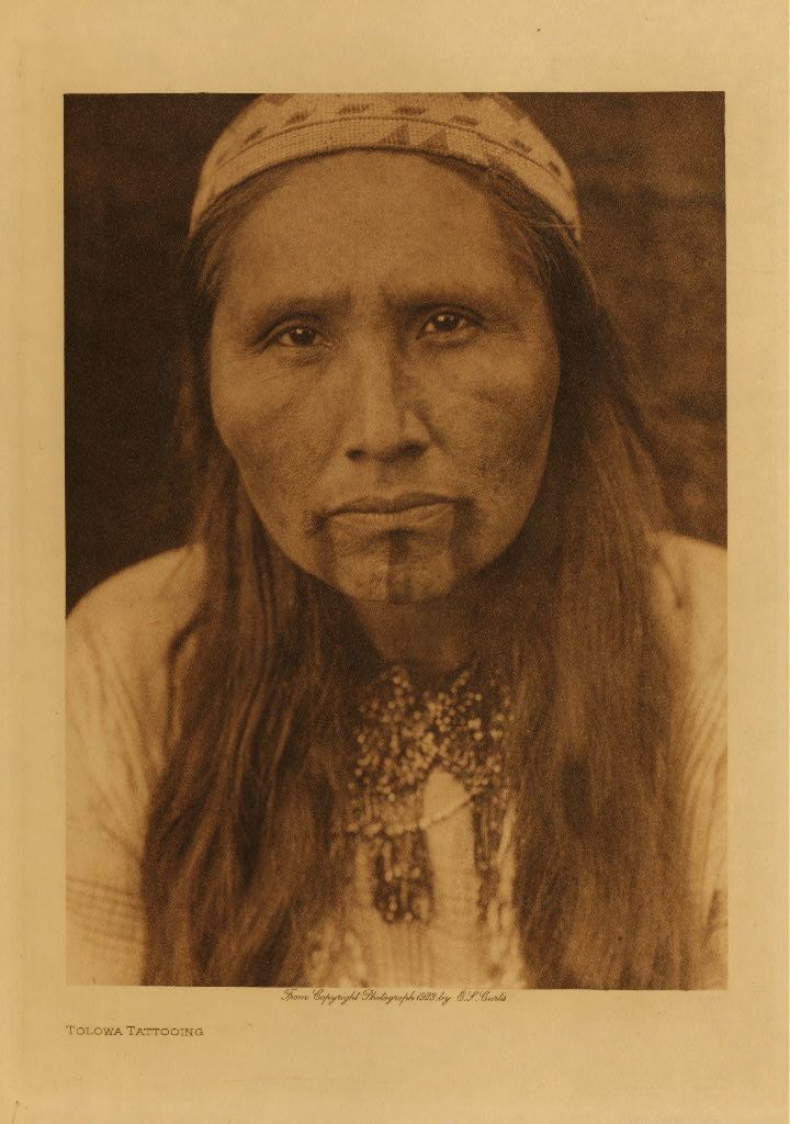 The females were all tattooed on the face with a dark line being drawn from the corner of their mouth and crossing up on their cheek. Also from the middle of the underlip down on the chin. This is done in youth and appears to be done to distinguish the different tribes, or rather families, that live about 10 or 15 miles apart. Each group is often called by a different name.